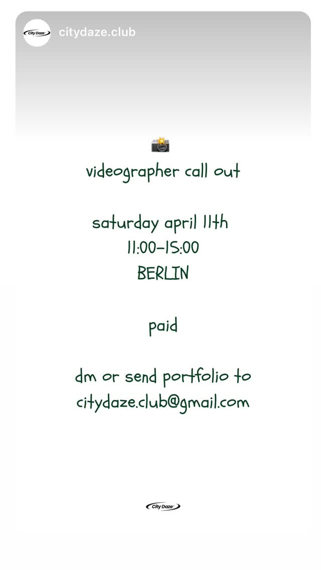 videographer call out for a shoot in berlin on saturday april 11th from 11:00-15:00. dm or send portfolio to citydaze.club@gmail.com.