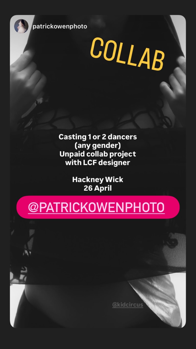 casting 1 or 2 dancers of any gender for an unpaid collab project with an lcf designer.