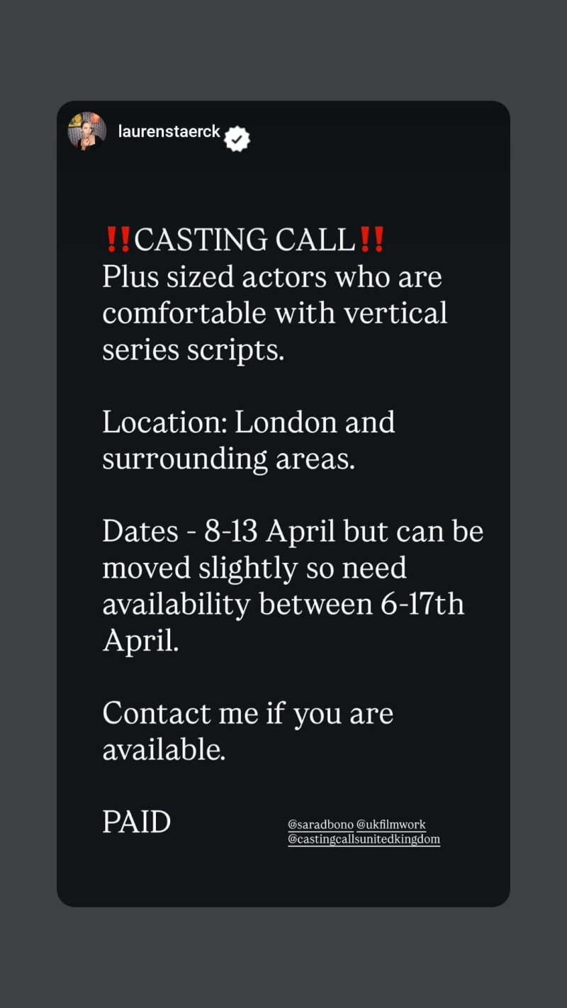 casting call for plus sized actors comfortable with vertical series scripts. shoot is in london and surrounding areas, with availability needed across early to mid april.