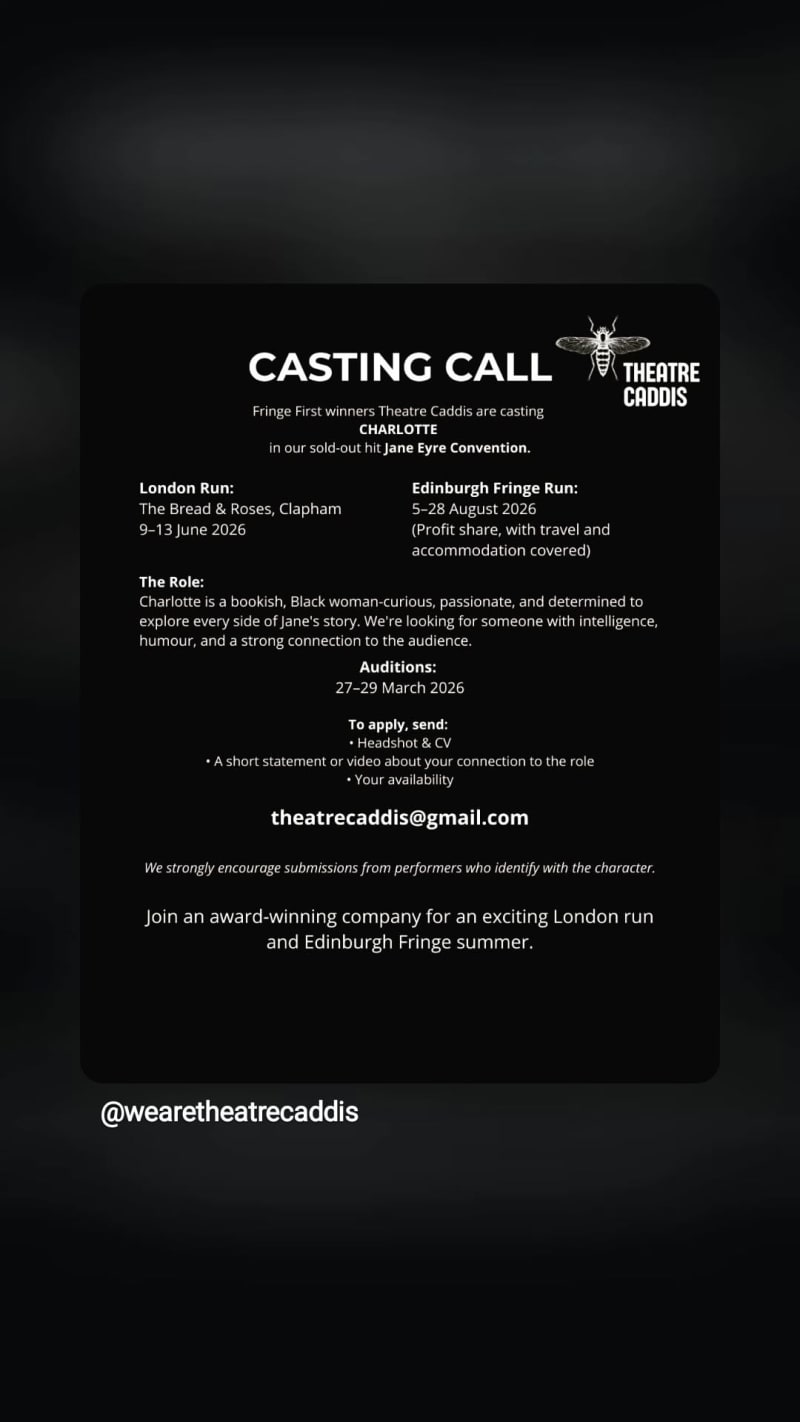 casting charlotte in jane eyre convention for a london run and edinburgh fringe run. looking for a bookish, passionate and determined performer with intelligence, humour and a strong connection to the audience.