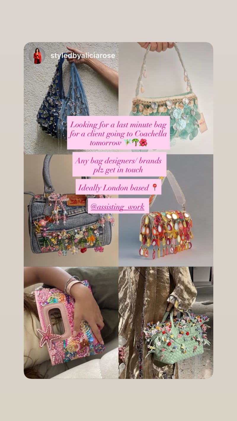 looking for a last-minute bag for a client going to coachella tomorrow. bag designers or brands, ideally london based, should get in touch.