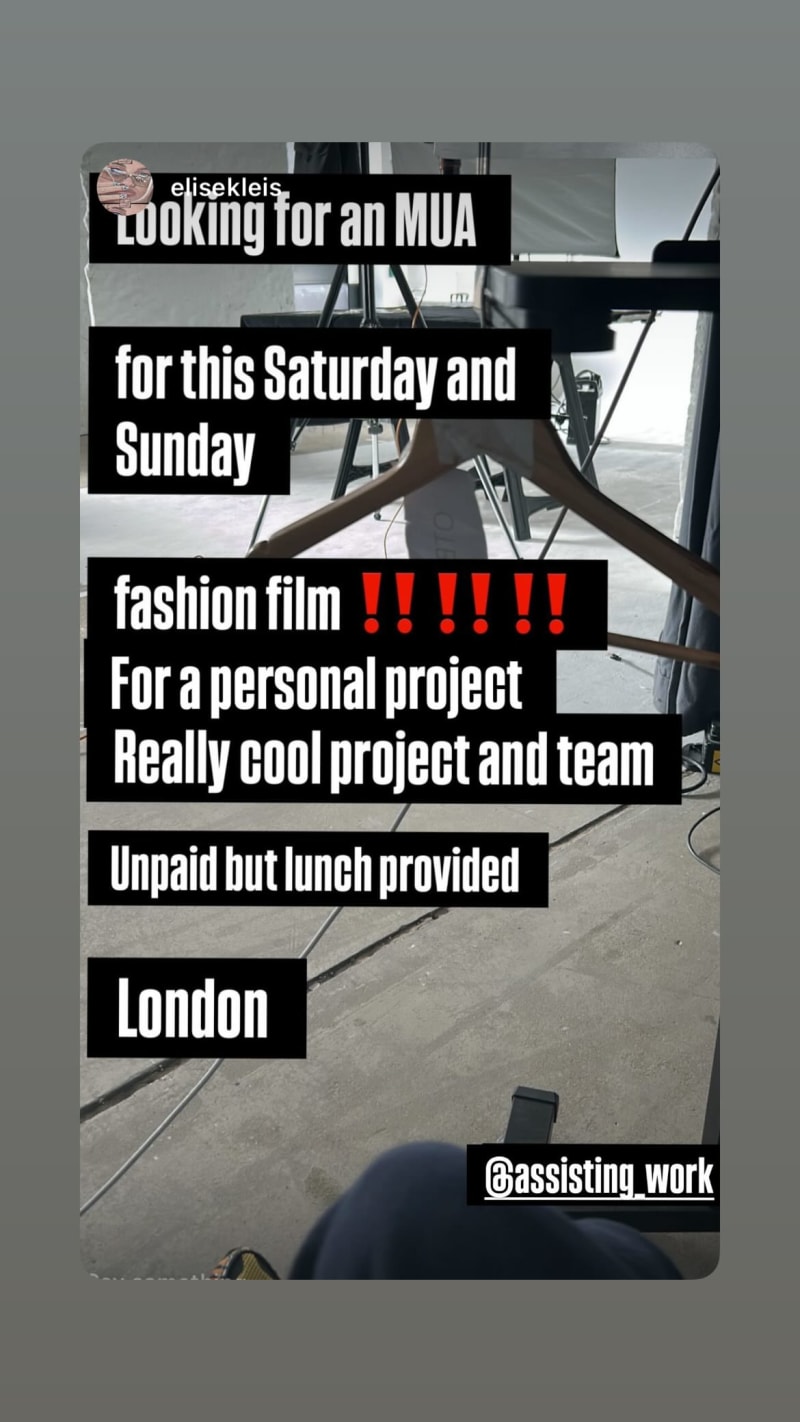 looking for an mua for a fashion film on saturday and sunday for a personal project. unpaid but lunch provided.