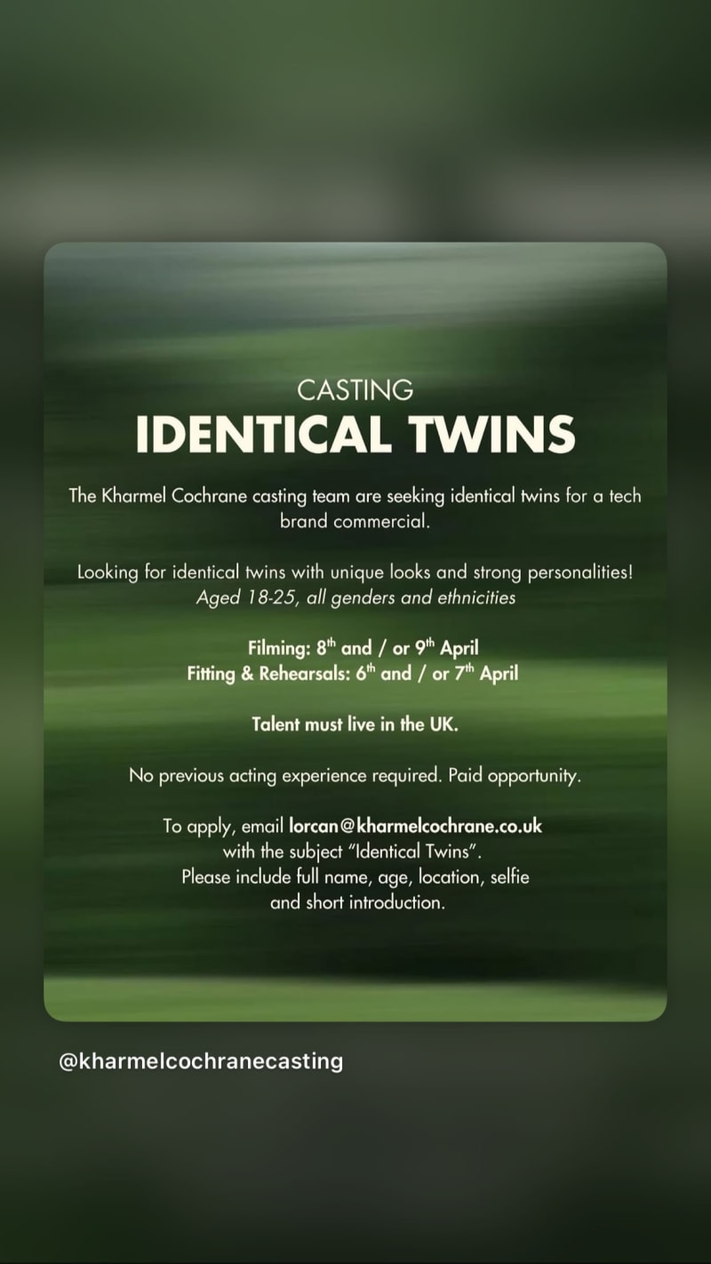 seeking identical twins with unique looks and strong personalities for a tech brand commercial. no previous acting experience required.