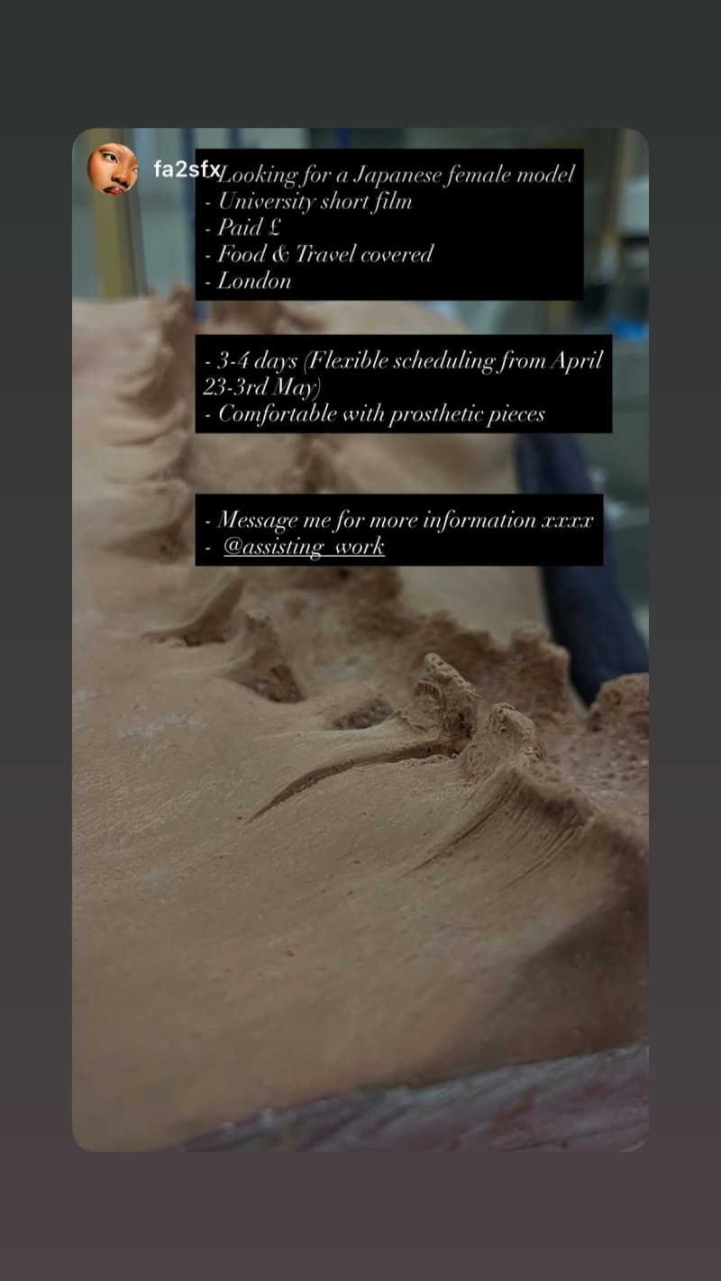 seeking a japanese female model for a university short film in london. paid role, with food and travel covered, for 3-4 days and must be comfortable with prosthetic pieces.