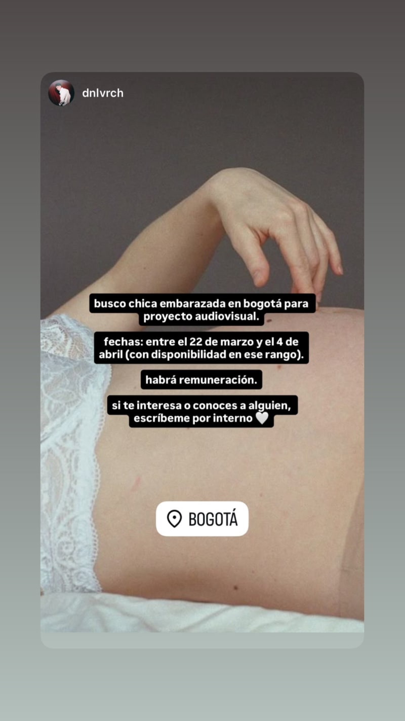 seeking a pregnant woman in bogotá for an audiovisual project, with availability between 22 march and 4 april. paid opportunity; interested people should message privately.
