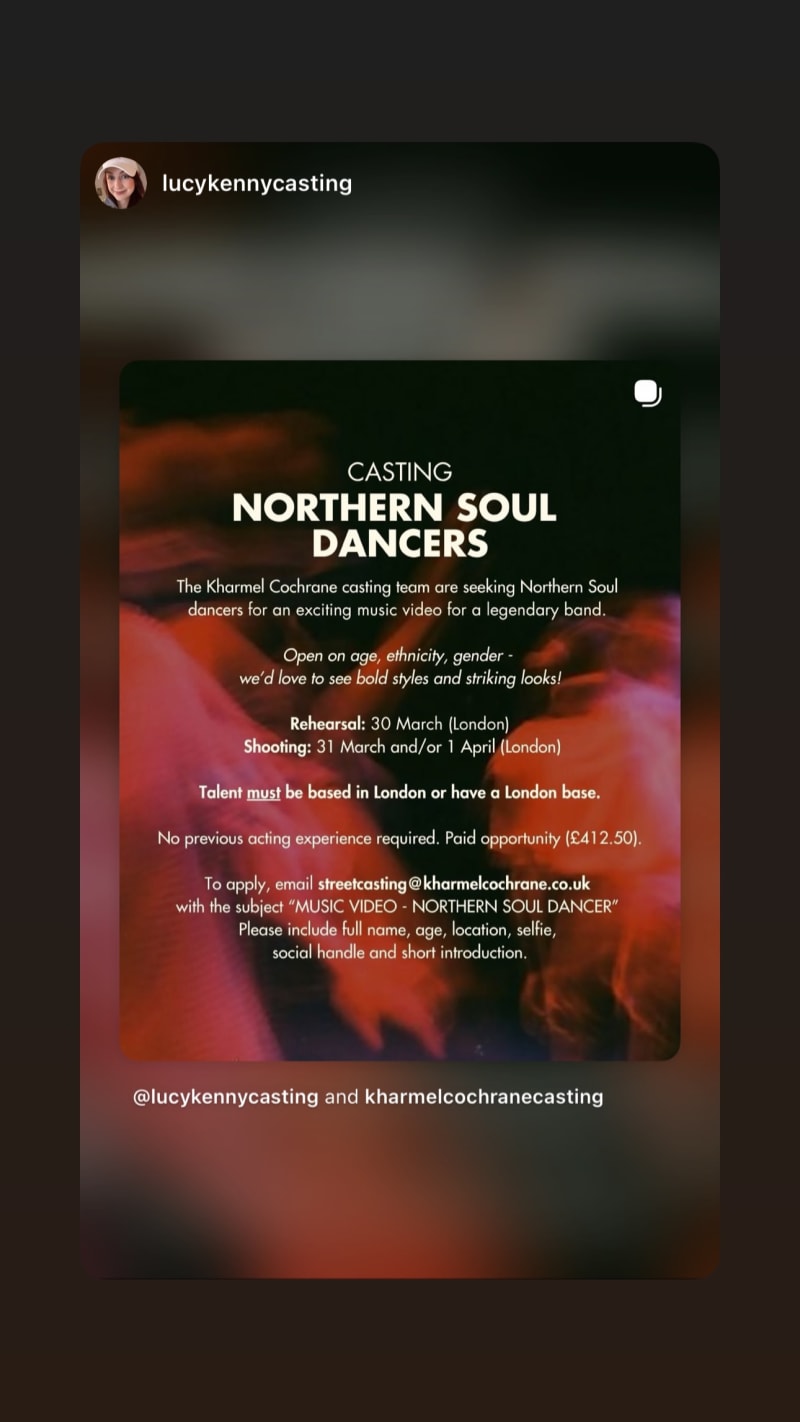 casting northern soul dancers for a music video for a legendary band. open on age, ethnicity and gender, with bold styles and striking looks; no previous acting experience required.