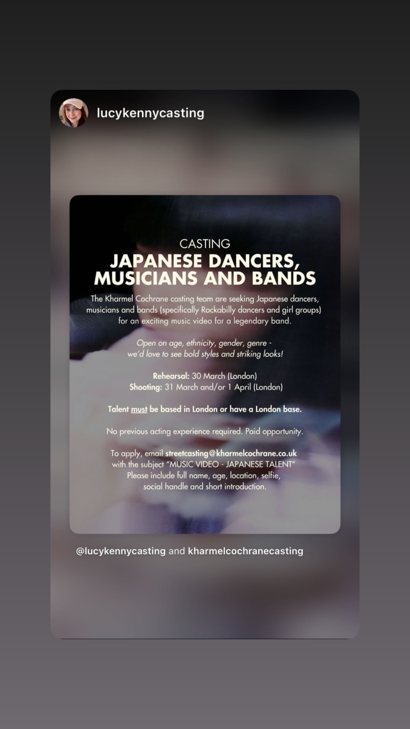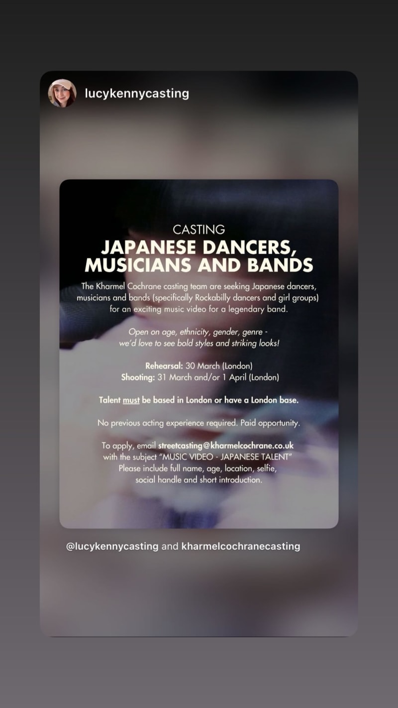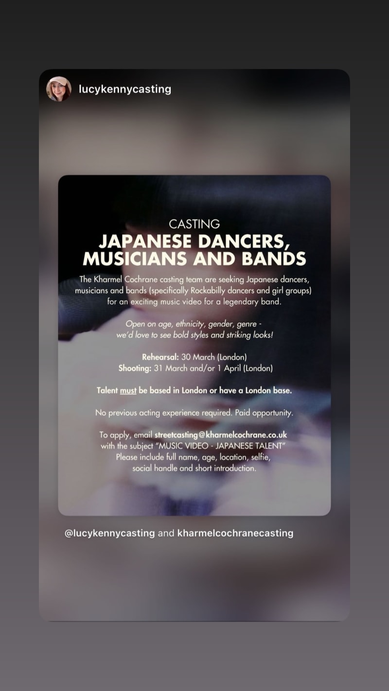casting japanese dancers, musicians and bands, specifically rockabilly dancers and girl groups, for a music video for a legendary band. talent must be based in london or have a london base; no previous acting experience required.