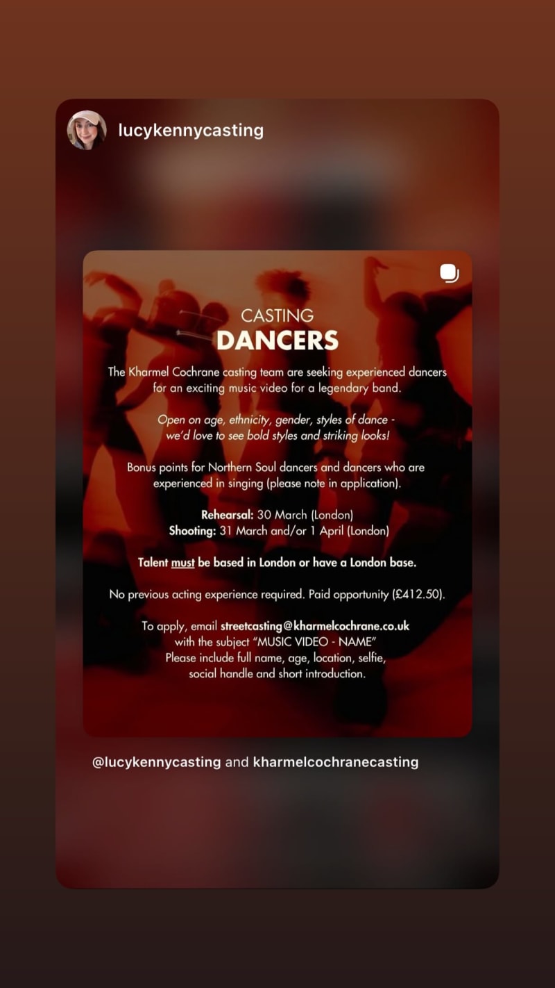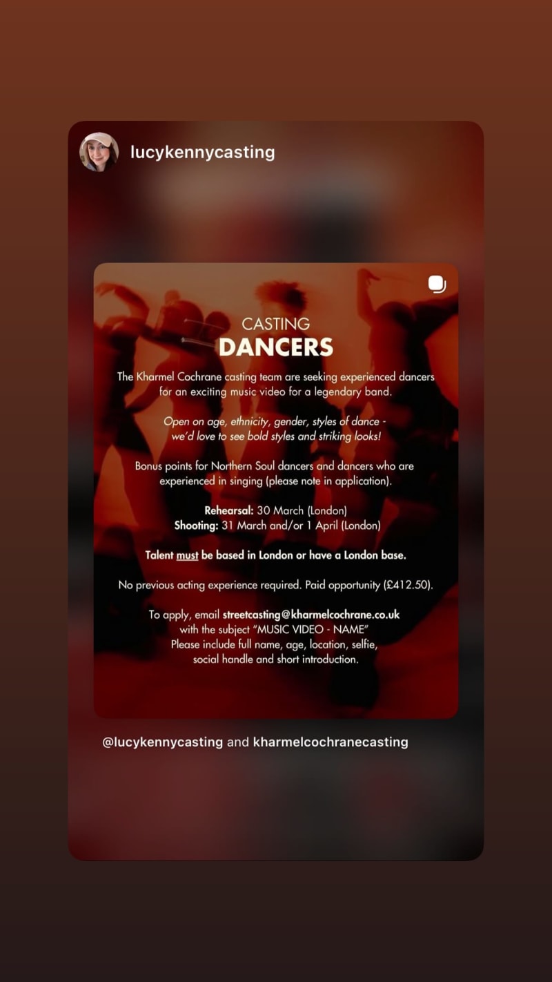 casting experienced dancers for a music video for a legendary band. open on age, ethnicity, gender and dance styles, with bonus points for northern soul dancers and those experienced in singing.