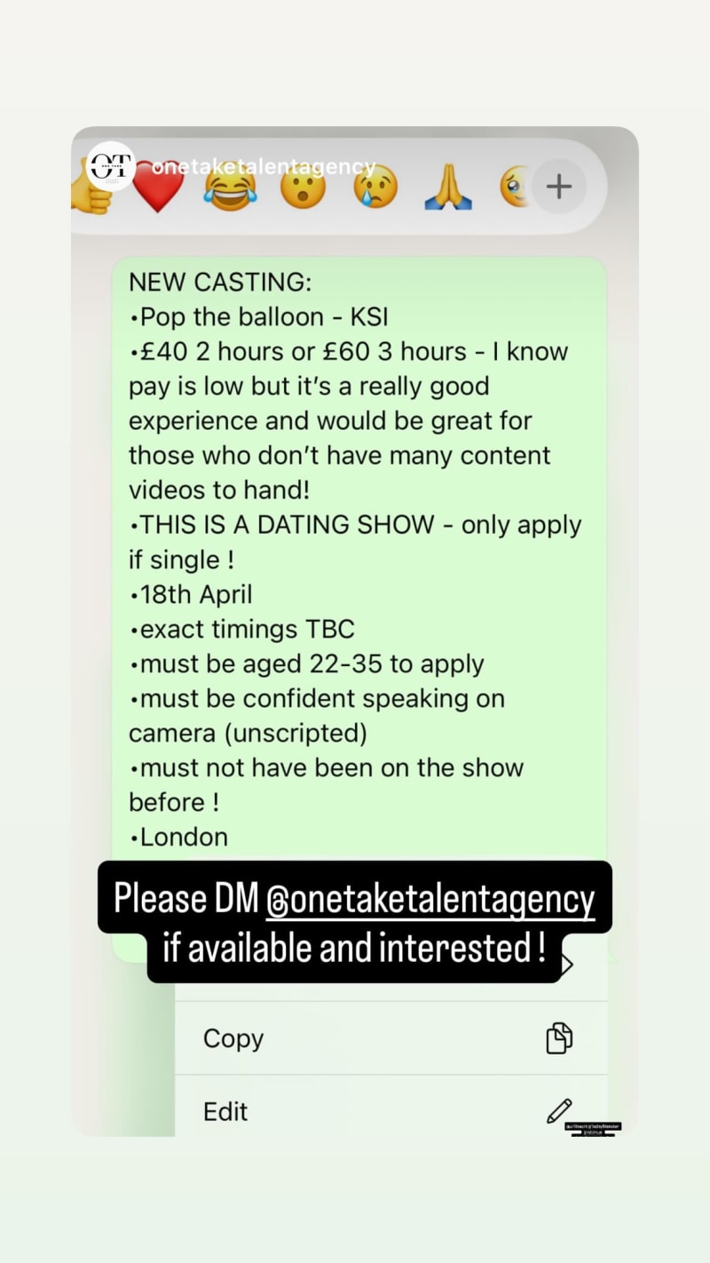 casting for ksi's 'pop the balloon' dating show in london. applicants must be single, aged 22-35, confident speaking on camera unscripted, and not have been on the show before.