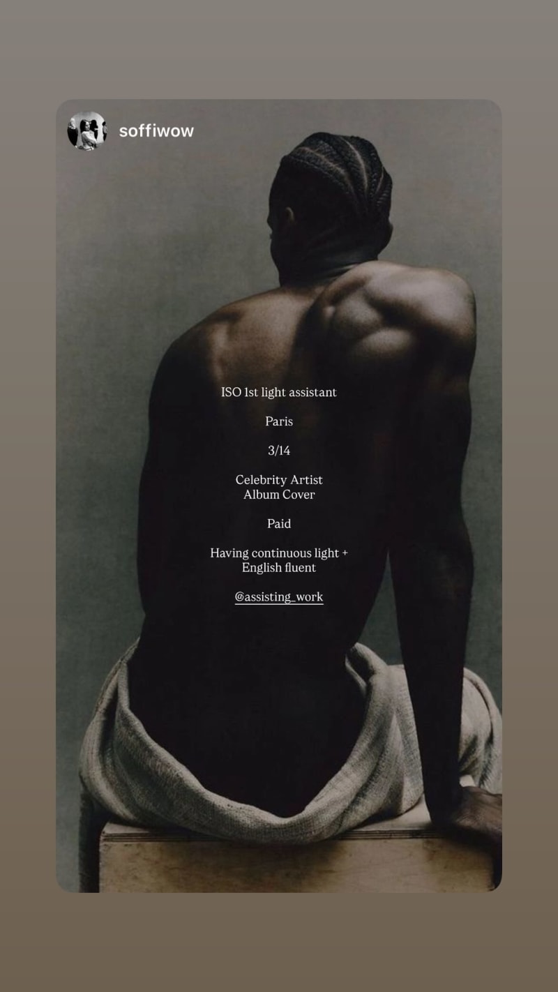 iso 1st light assistant in paris for a celebrity artist album cover; must have continuous light and be english fluent.