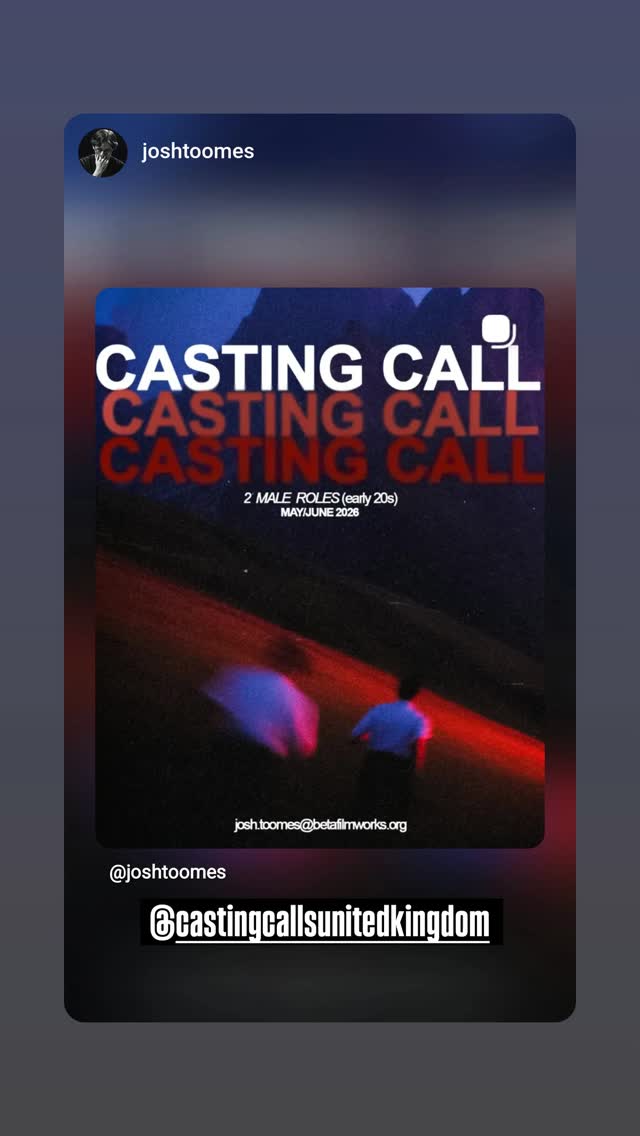 casting call for 2 male roles in their early 20s for a project shooting in may/june 2026. contact via josh.toomes@betafilmworks.org.