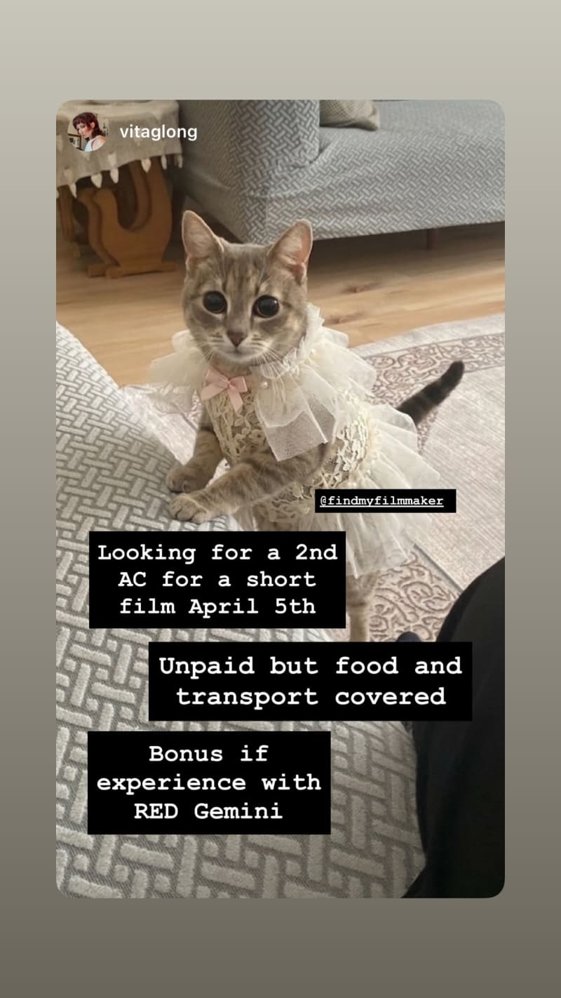 looking for a 2nd ac for a short film on 05/04/26. food and transport are covered, and experience with red gemini is a bonus.