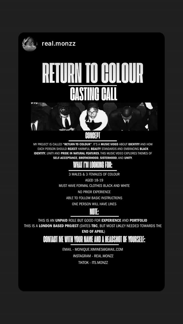 casting call for a music video about identity, self-acceptance, brotherhood, sisterhood, and unity. looking for ages 18-19, able to follow basic instructions, with one person having lines.