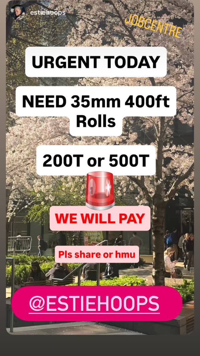 urgent request for 35mm 400ft rolls, 200t or 500t. they will pay and ask people to share or hmu.