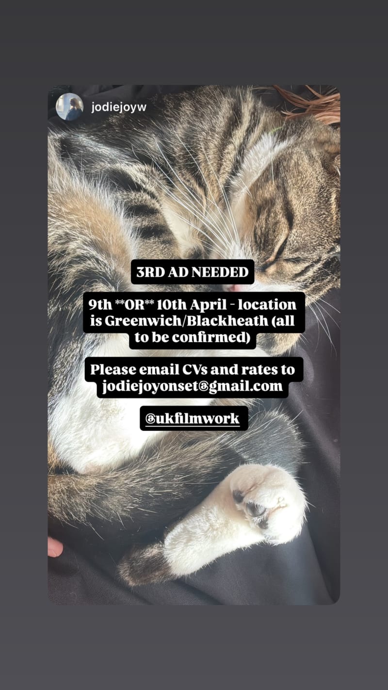 3rd ad needed for a shoot in greenwich/blackheath, with all details to be confirmed. please email cvs and rates to jodiejoyonset@gmail.com.