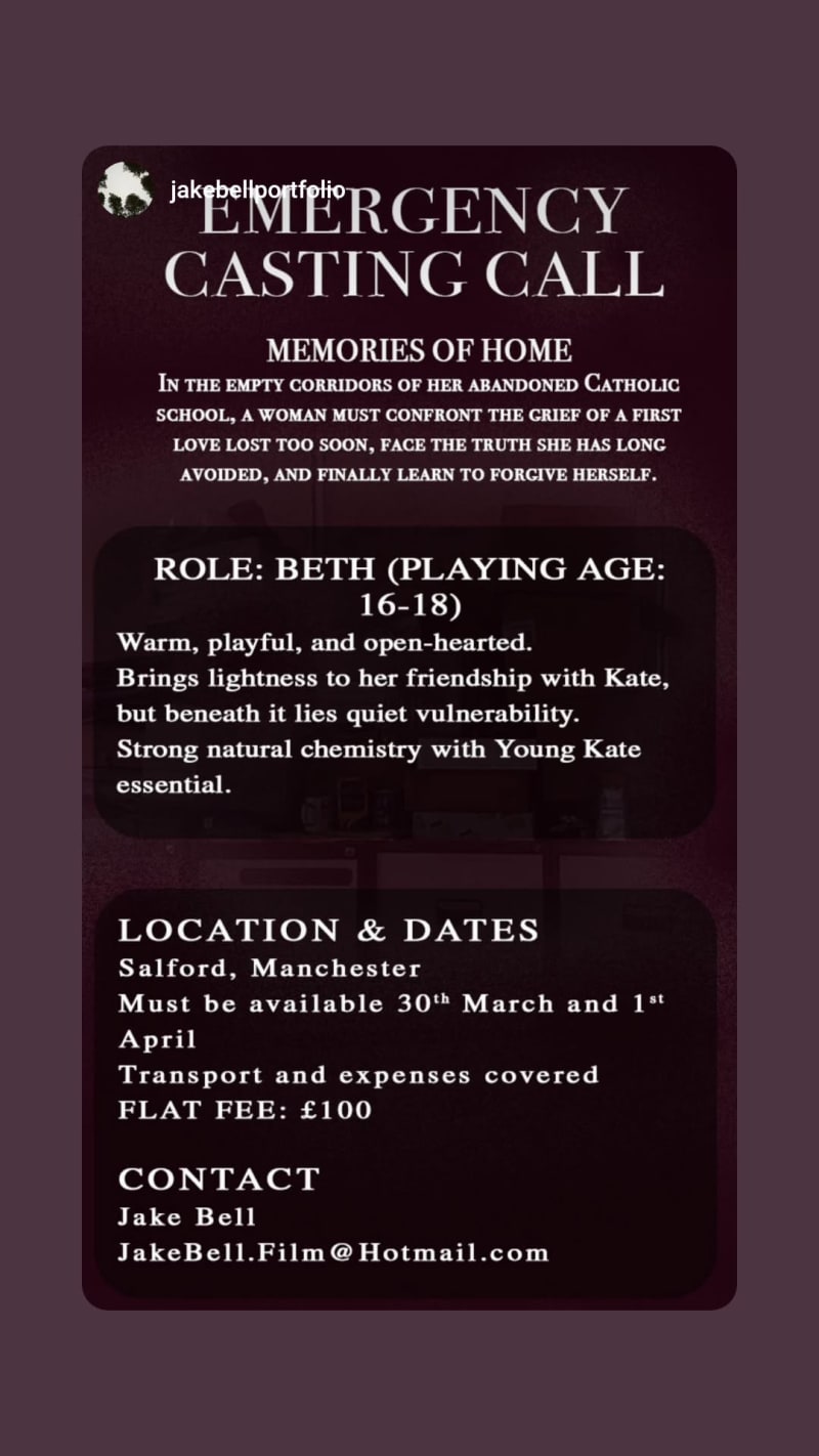 playing beth, aged 16-18, warm, playful and open-hearted, with quiet vulnerability. strong natural chemistry with young kate is essential for the film "memories of home".