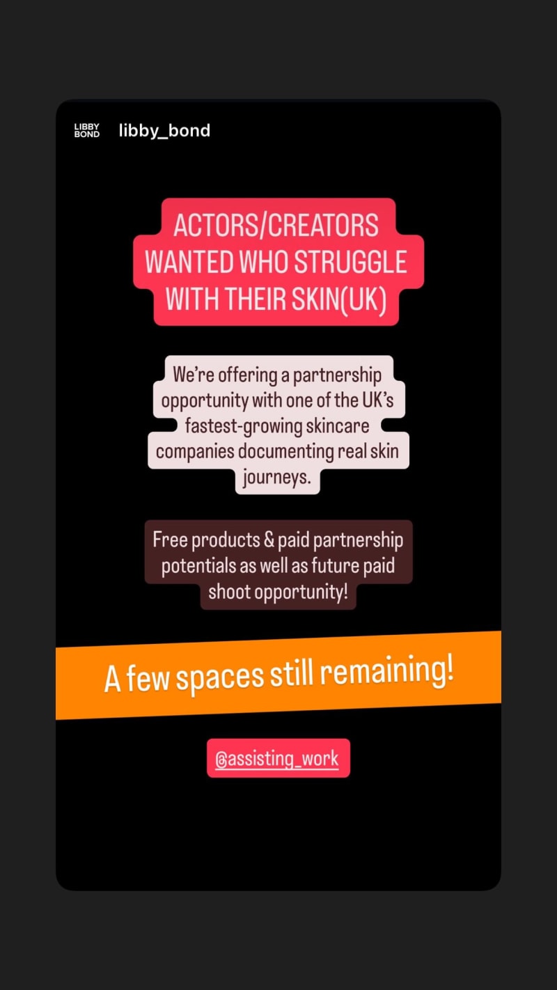 seeking actors/creators in the united kingdom who struggle with their skin for a partnership with a fast-growing skincare company documenting real skin journeys. includes free products, paid partnership potential, and possible future paid shoot opportunities.
