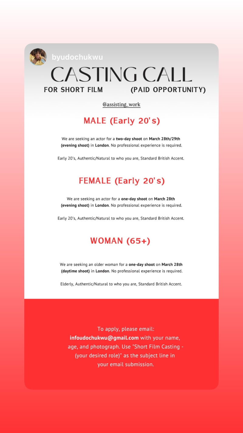 paid casting call for a short film seeking authentic/natural performers with a standard british accent in london. no professional experience is required; shoots take place on 28/03/26 and 29/03/26 depending on role.