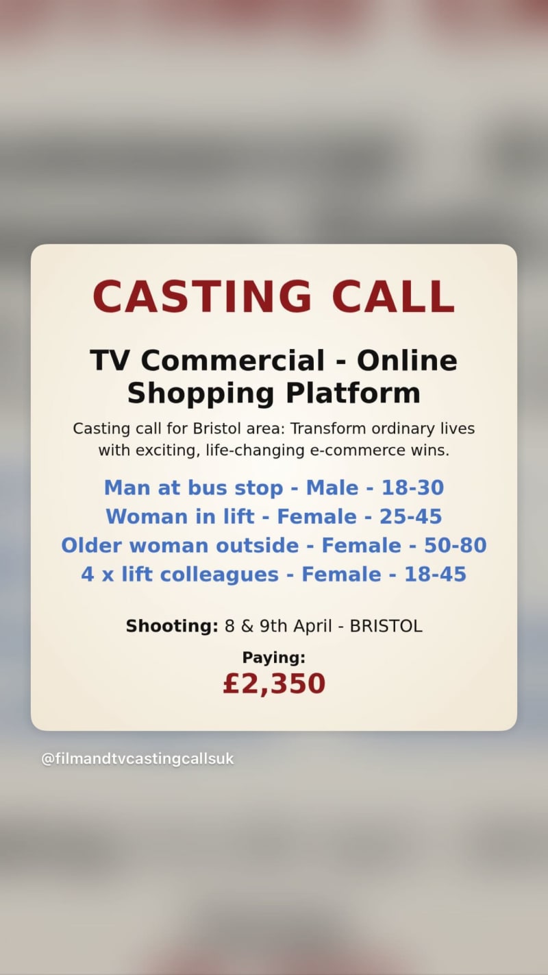 casting for a tv commercial for an online shopping platform, seeking a man at a bus stop, a woman in a lift, an older woman outside, and 4 lift colleagues. shoot is in bristol for an e-commerce campaign.