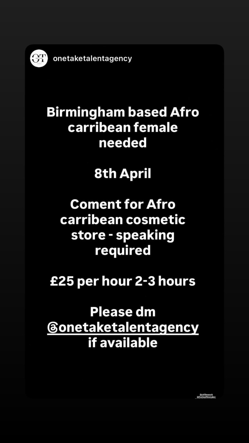 birmingham-based afro-caribbean female needed for content for an afro-caribbean cosmetic store. speaking required; rate is £25 per hour for 2-3 hours.