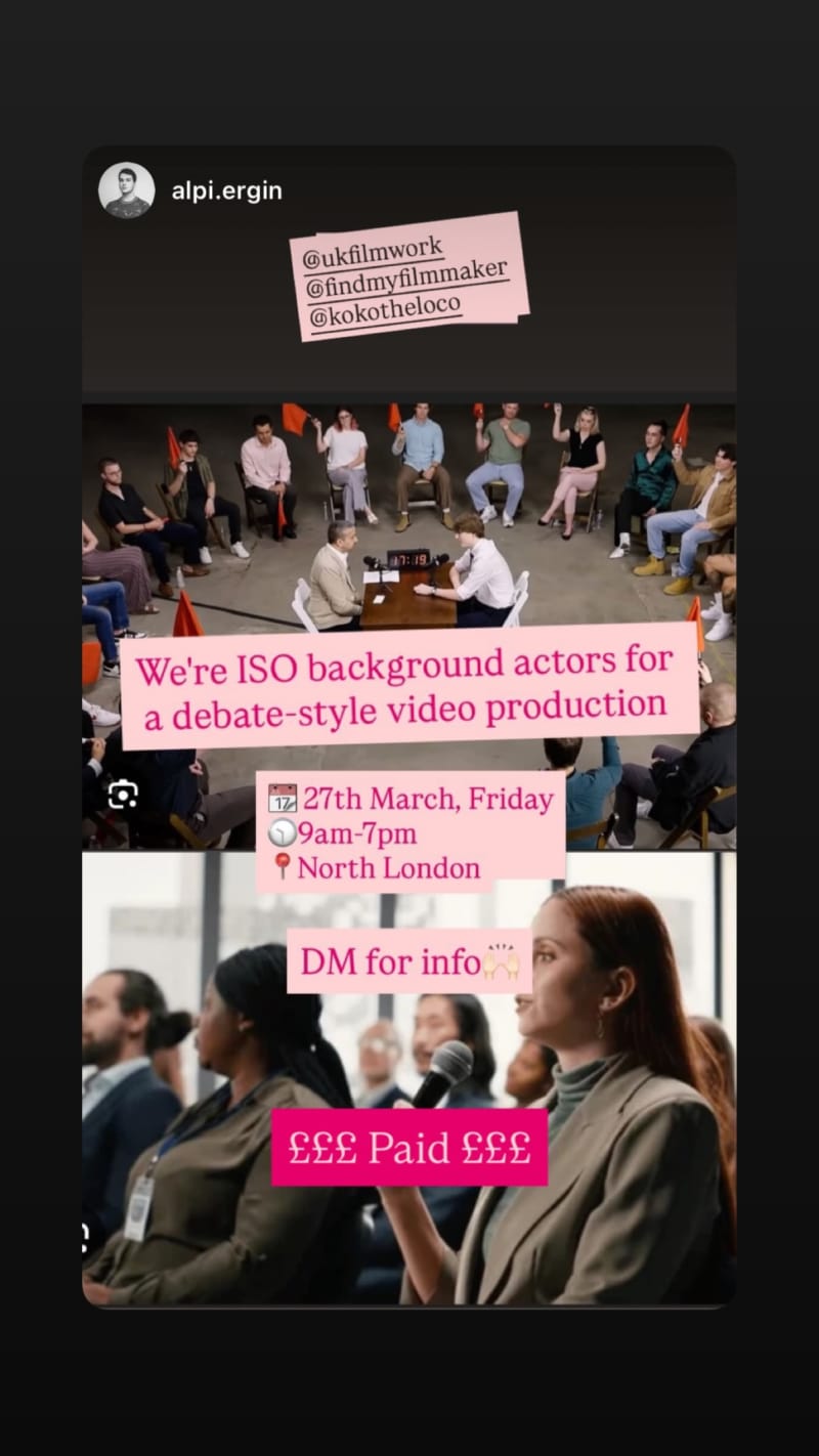 background actors needed for a debate-style video production. shoot is 9am-7pm in north london; dm for info.