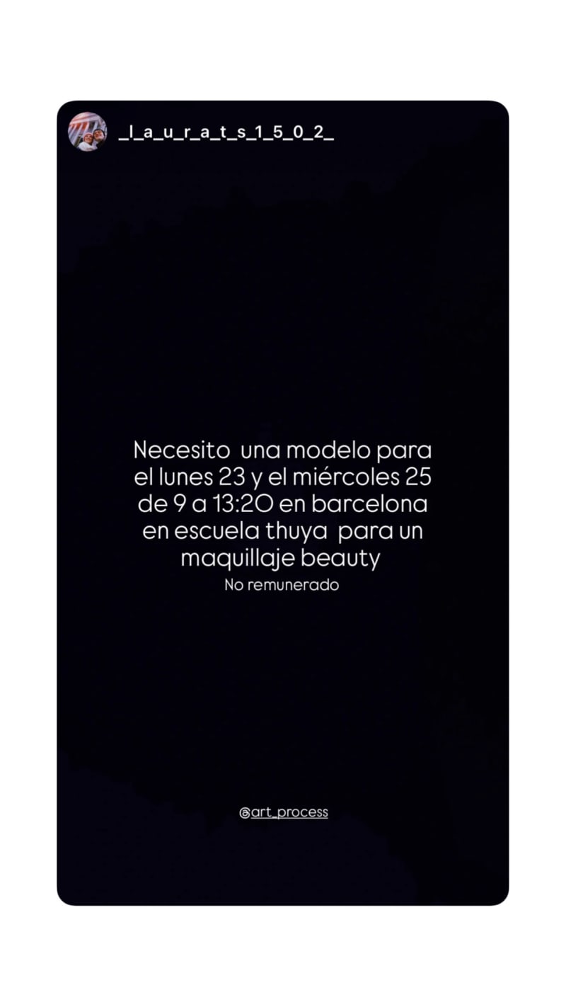 seeking a model for beauty makeup sessions at escuela thuya in barcelona from 9:00 to 13:20 on monday 23 and wednesday 25. this is unpaid.