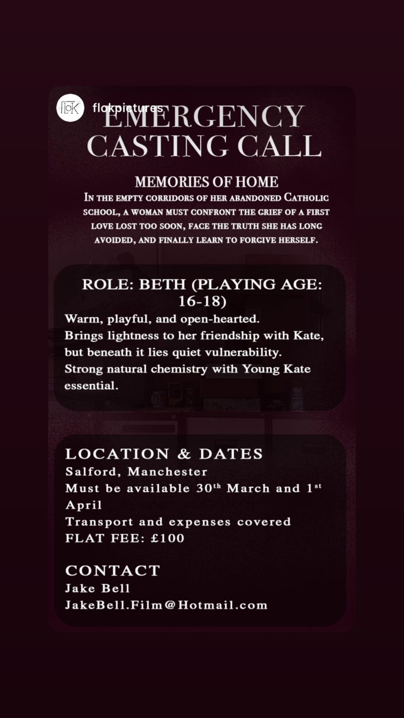for "memories of home," casting beth: warm, playful and open-hearted, bringing lightness to her friendship with kate while carrying quiet vulnerability. strong natural chemistry with young kate is essential.