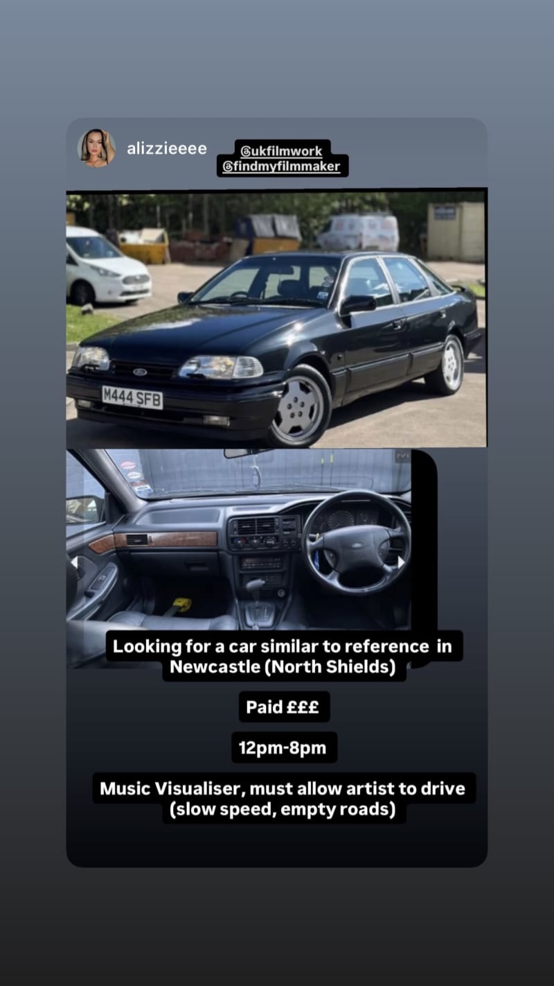 seeking a car similar to the reference for a music visualiser, and it must allow the artist to drive it at slow speed on empty roads. the booking is from 12pm to 8pm in north shields/newcastle.