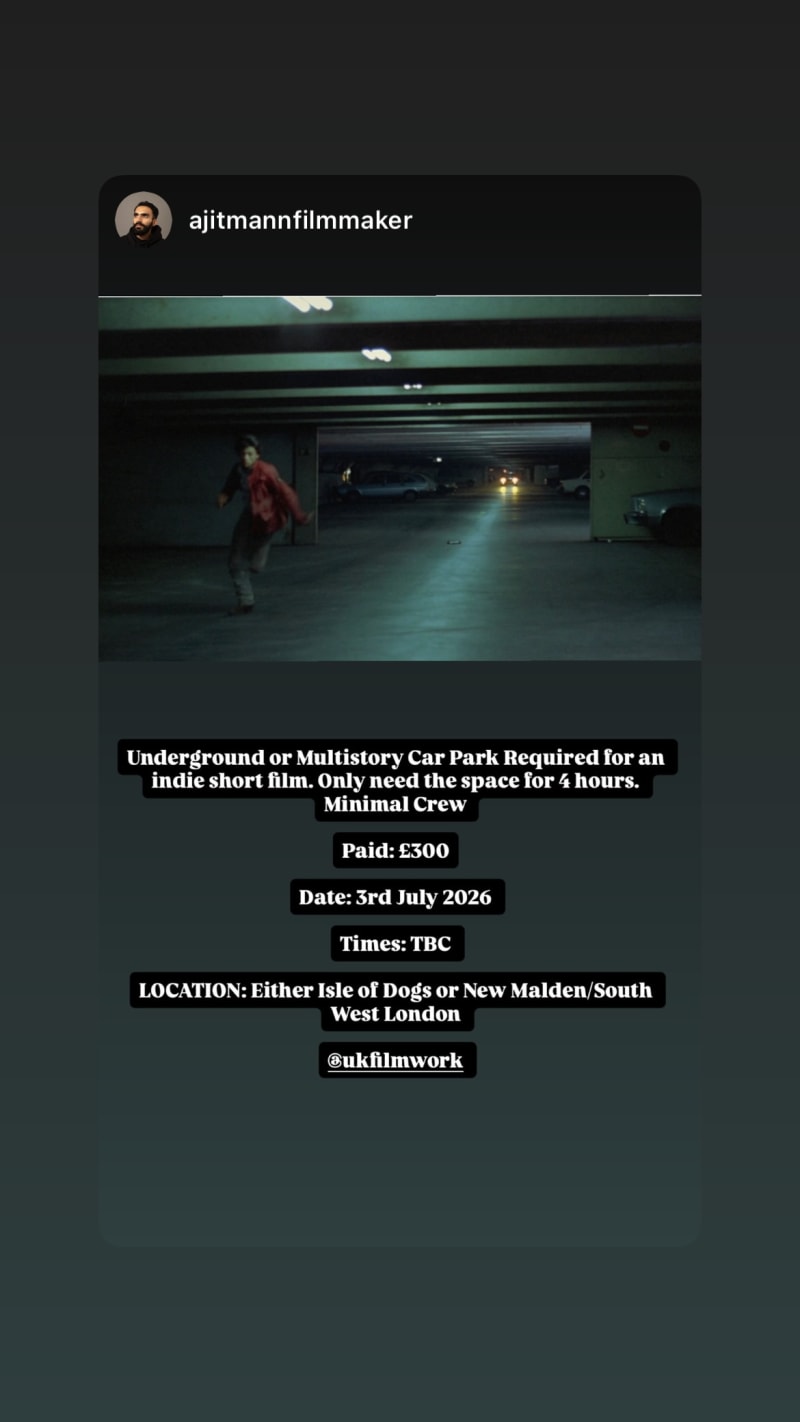 seeking an underground or multistorey car park for an indie short film for a 4-hour shoot with minimal crew.