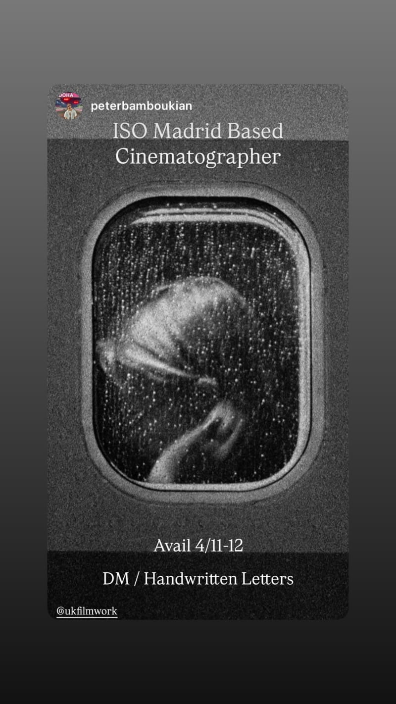 looking for a madrid-based cinematographer. available 04/11-12; contact via dm or handwritten letters.