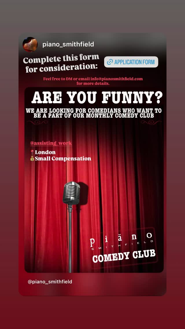 looking for comedians to be part of a monthly comedy club. applicants are asked to complete an application form and can dm or email for more details.