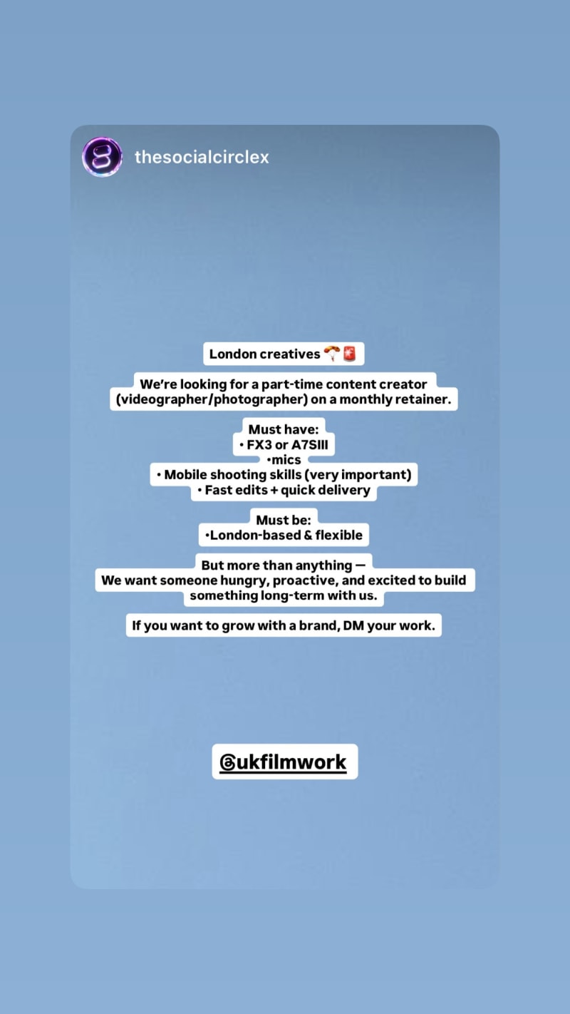 part-time monthly retainer role creating content as videographer/photographer. must have FX3 or A7SIII, mics, strong mobile shooting, fast edits + quick delivery; london-based & flexible.