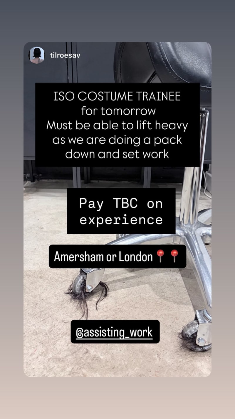 costume trainee needed for tomorrow to help with pack down and set work. must be able to lift heavy.