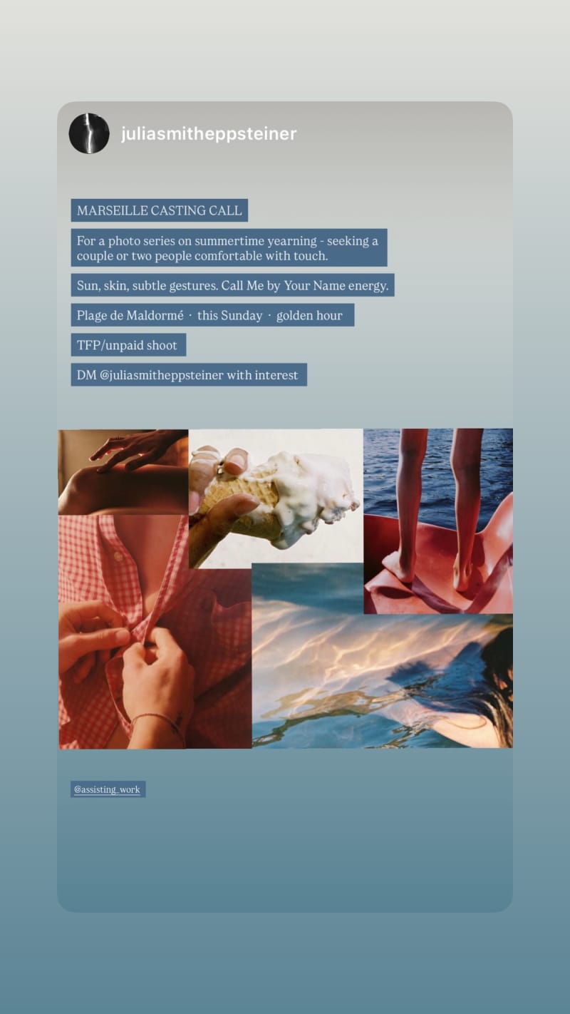 seeking a couple or two people comfortable with touch for a photo series on summertime yearning. shooting at golden hour with a sun, skin, subtle gestures, call me by your name energy.