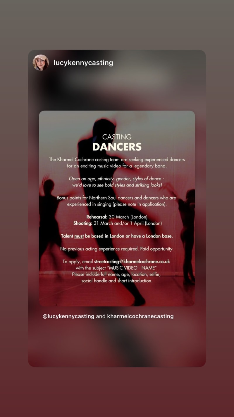 experienced dancers wanted for a music video for a legendary band. open on age, ethnicity, gender and dance styles, with interest in bold styles and striking looks; northern soul dancers and dancers with singing experience are a bonus.
