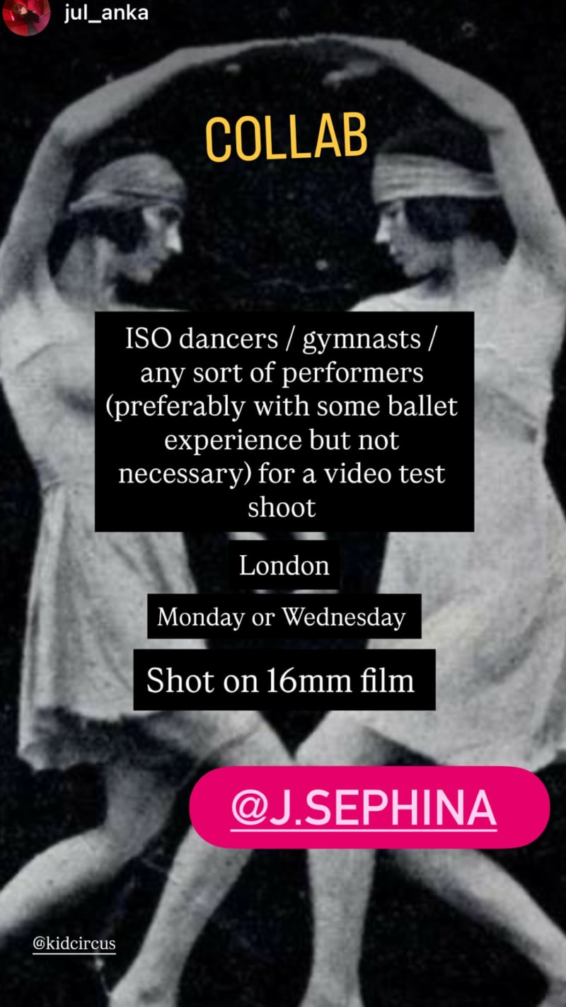 collab for a video test shoot, preferably with some ballet experience but not necessary. shot on 16mm film.