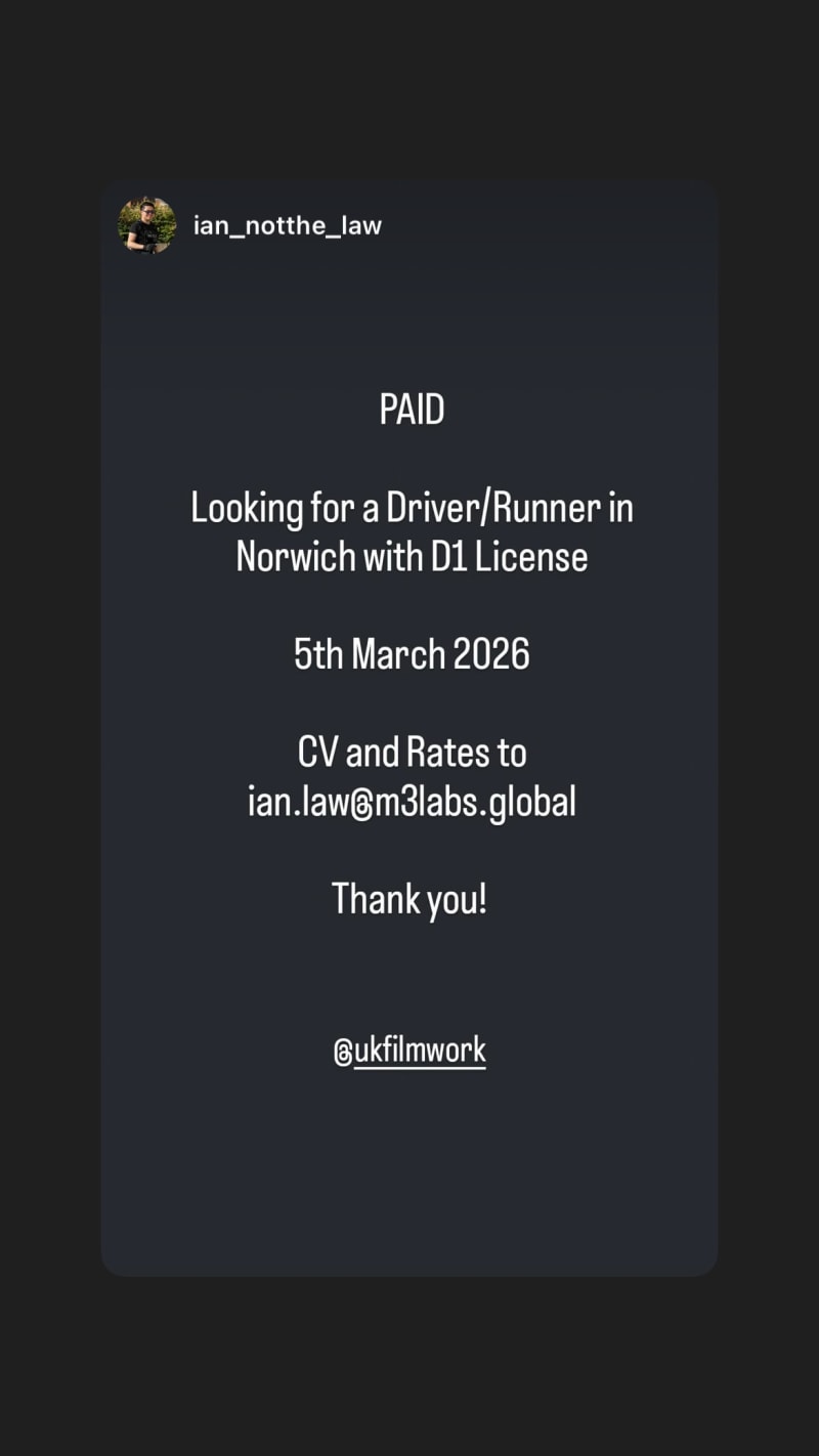 looking for a driver/runner in norwich with D1 license. send cv and rates to ian.law@m3labs.global.