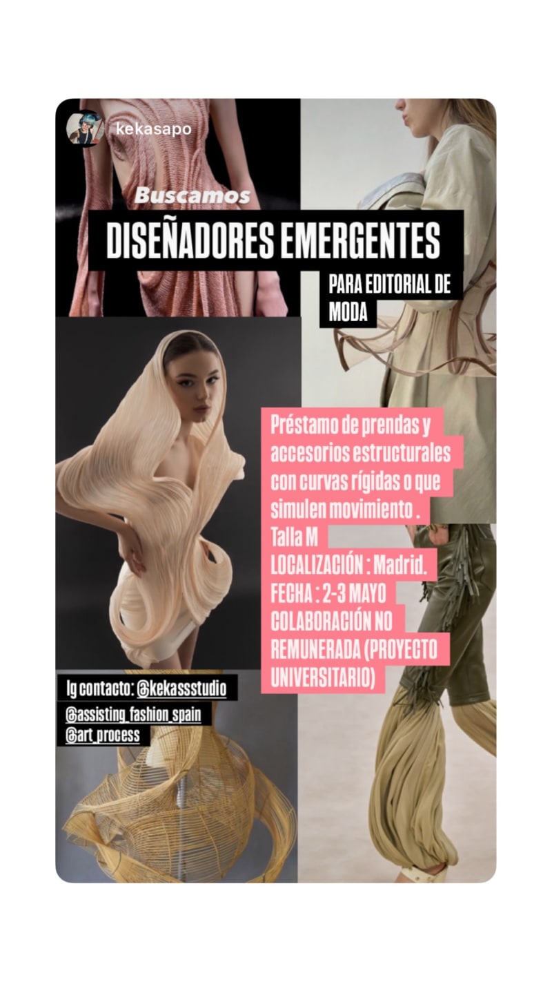 seeking emerging designers for a fashion editorial, lending garments and structural accessories with rigid curves or pieces that simulate movement. size m.