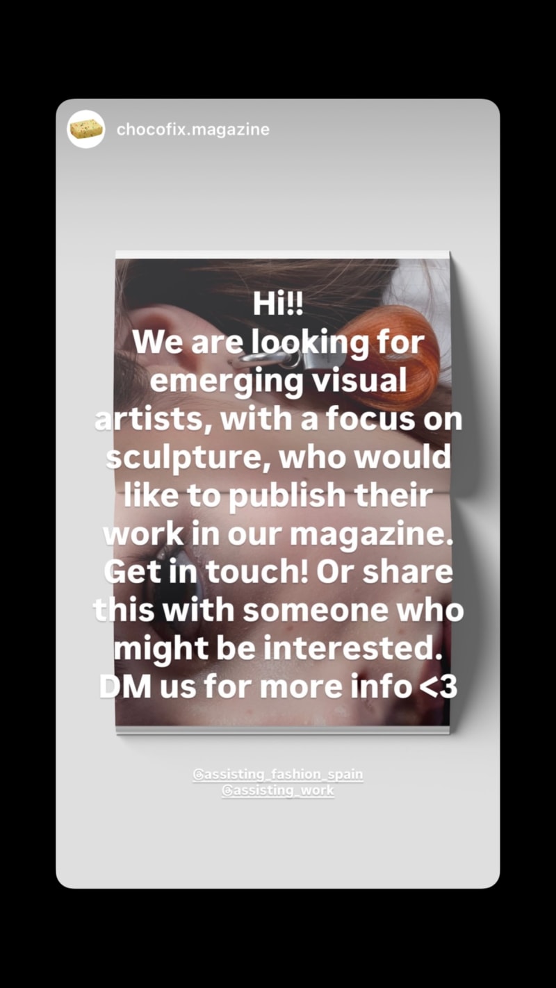 looking for emerging visual artists with a focus on sculpture to publish their work in the magazine. interested people should dm for more info.