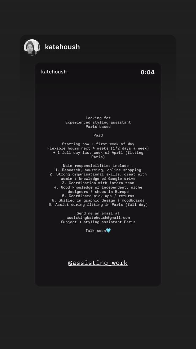 paid paris-based styling assistant role starting now through the first week of may. responsibilities include research, sourcing, online shopping, admin, coordination, designer and shop knowledge, pickups/returns, graphic design and moodboards, and assisting during a full-day fitting in paris.
