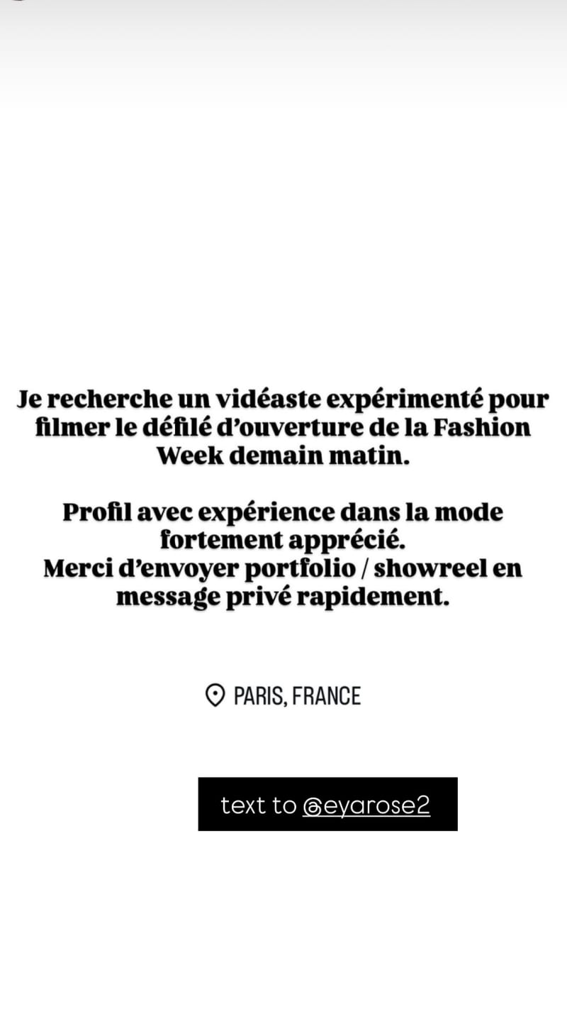 experienced videographer to film the opening fashion week show tomorrow morning. fashion experience strongly appreciated; send portfolio/showreel via dm asap.