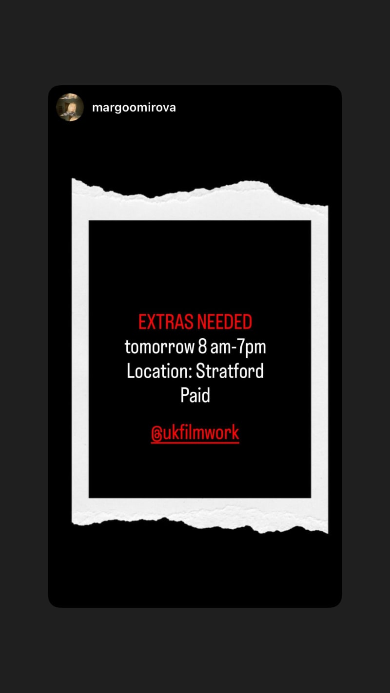 extras needed for a full-day shoot 8am–7pm in stratford; paid.