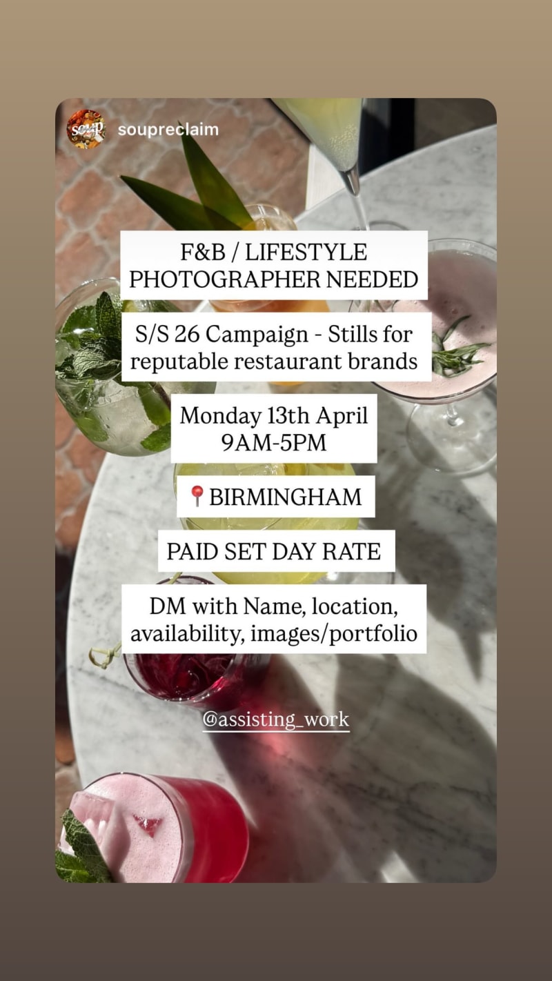 shoot stills for an s/s 26 campaign for reputable restaurant brands. set day runs 9am-5pm and applicants should dm name, location, availability, and images/portfolio.