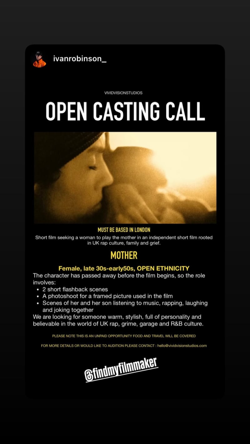 short film seeking a woman to play the mother in an independent short film rooted in uk rap culture, family and grief. role includes 2 short flashback scenes, a photoshoot for a framed picture, and scenes with her son listening to music, rapping, laughing and joking together.
