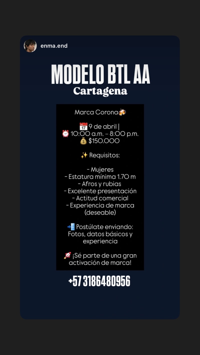 btl brand activation model for corona in cartagena. seeking women with minimum height 1.70 m, afro or blonde hair, excellent presentation, commercial attitude, and preferably brand experience.