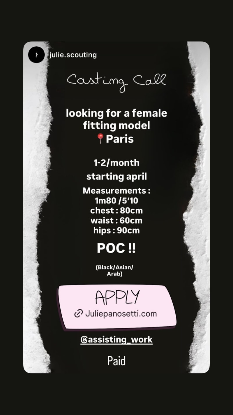 looking for a female fitting model in paris, 1-2 times per month starting april. seeking poc talent, specifically black, asian, or arab, with the listed measurements.