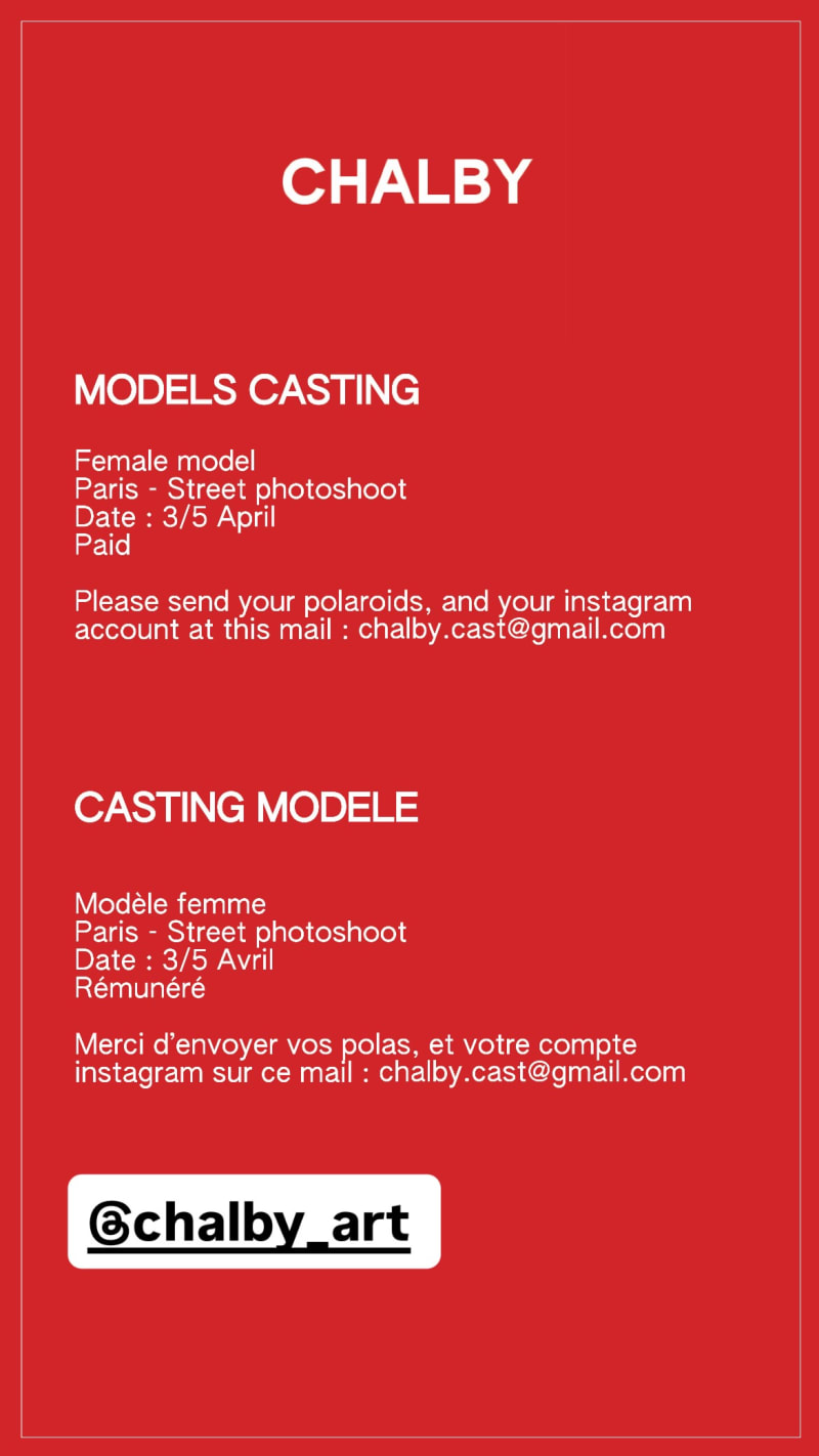 female model wanted for a street photoshoot in paris. send your polaroids and instagram account to the listed email.