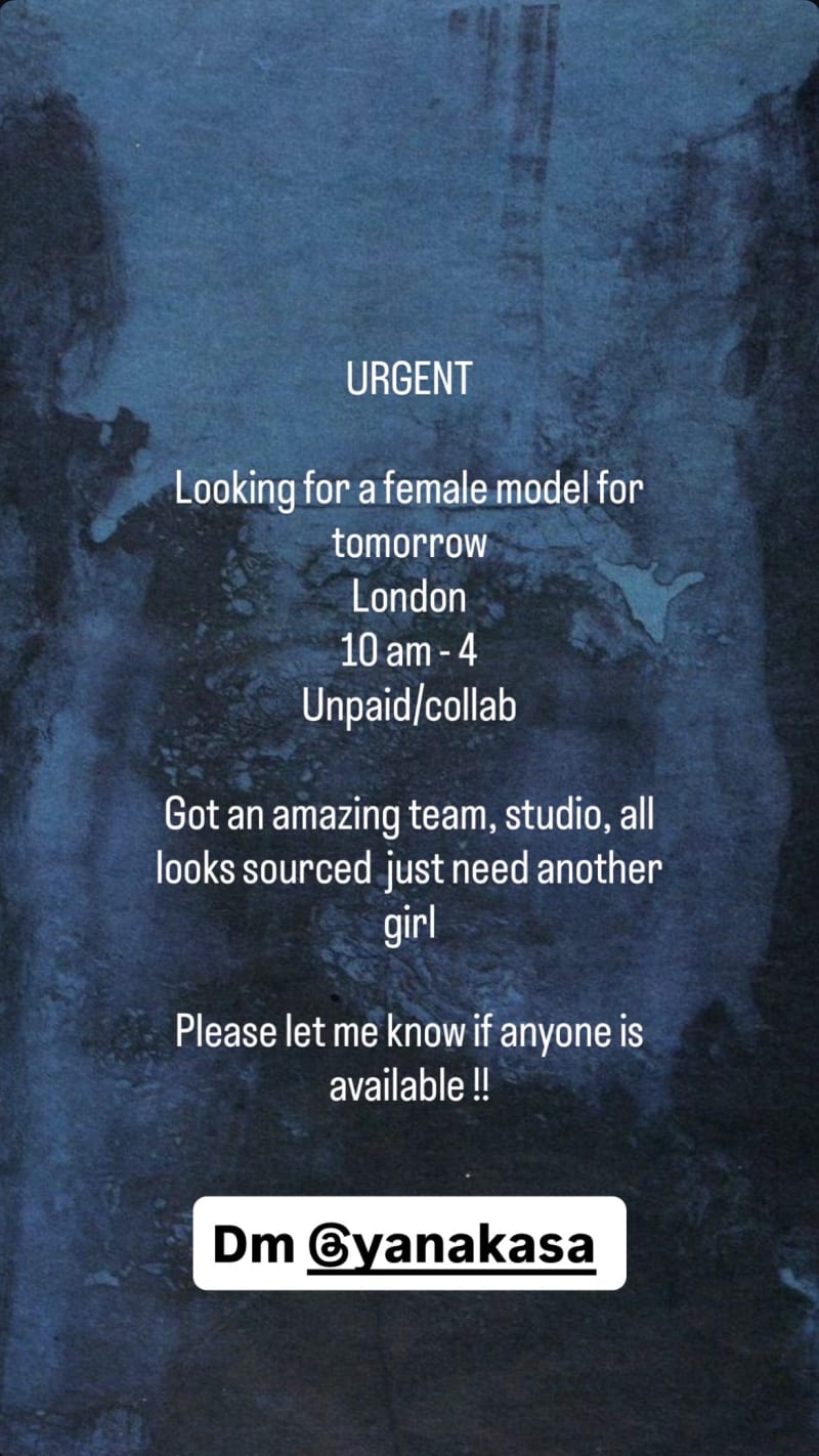looking for a female model for an urgent london shoot tomorrow from 10 am to 4. unpaid collab with an amazing team, studio, and all looks sourced.