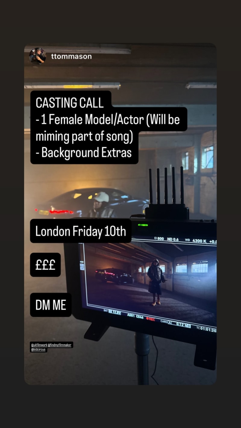 casting call for 1 female model/actor to mime part of a song, plus background extras.