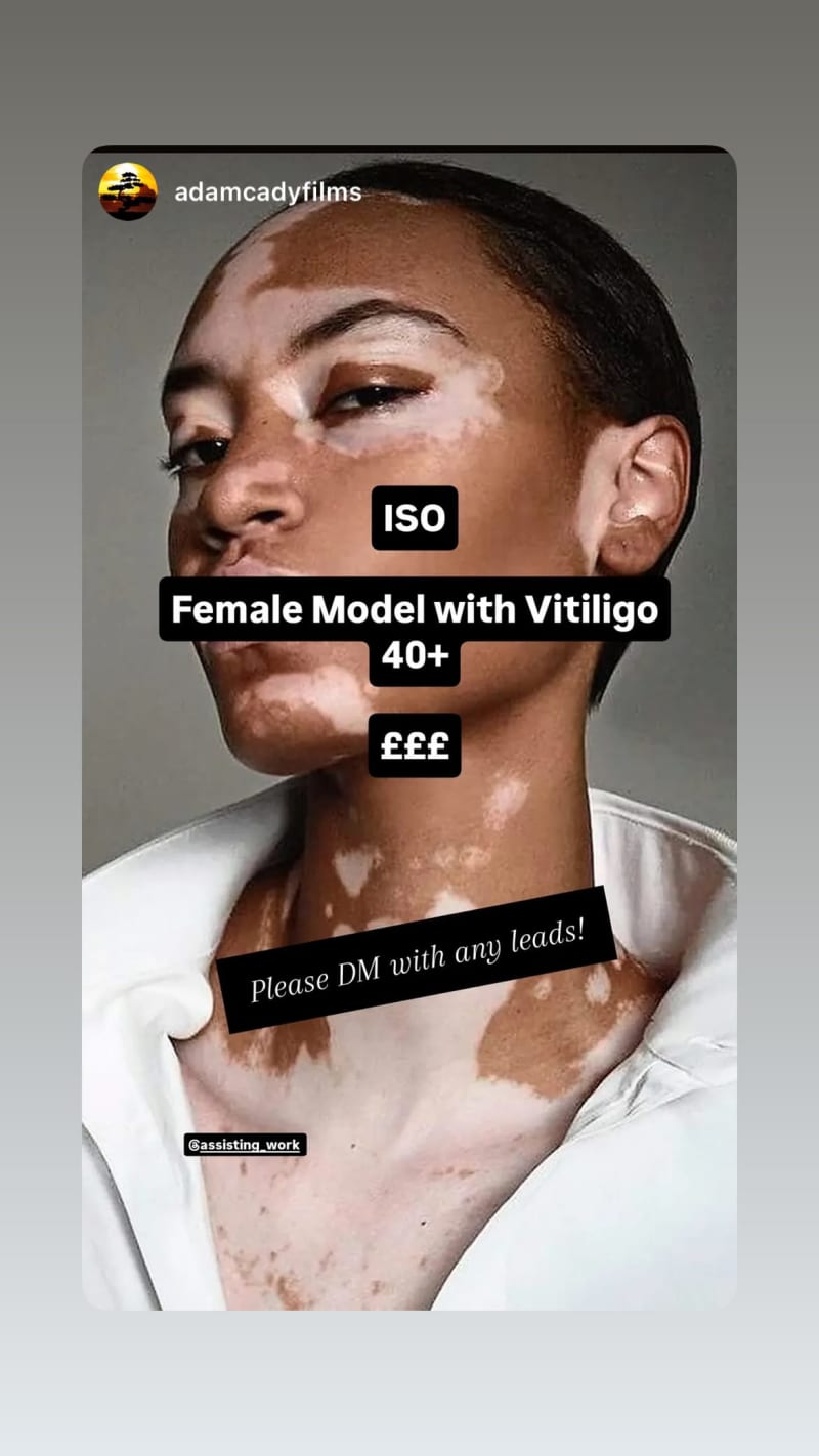 seeking a female model with vitiligo aged 40+; please dm with any leads.